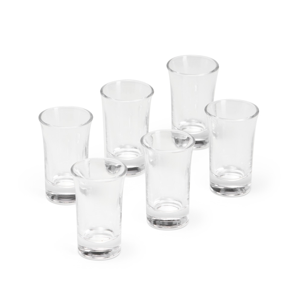 Kit com seis copos de vidro com capacidade máxima de 50ml cada.