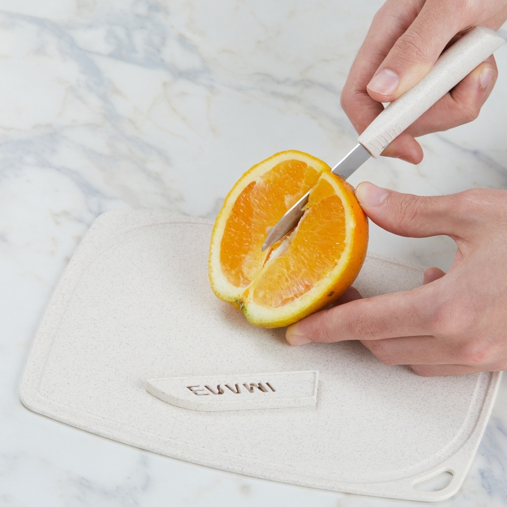 Kit Cozinha 3 Peças em plástico de palha de trigo e inox. Contém tesoura culinária, faca com protetor e descascador de legumes. Acompanha bandeja e tampa, podendo ser utilizada como recipiente e tábua para corte.