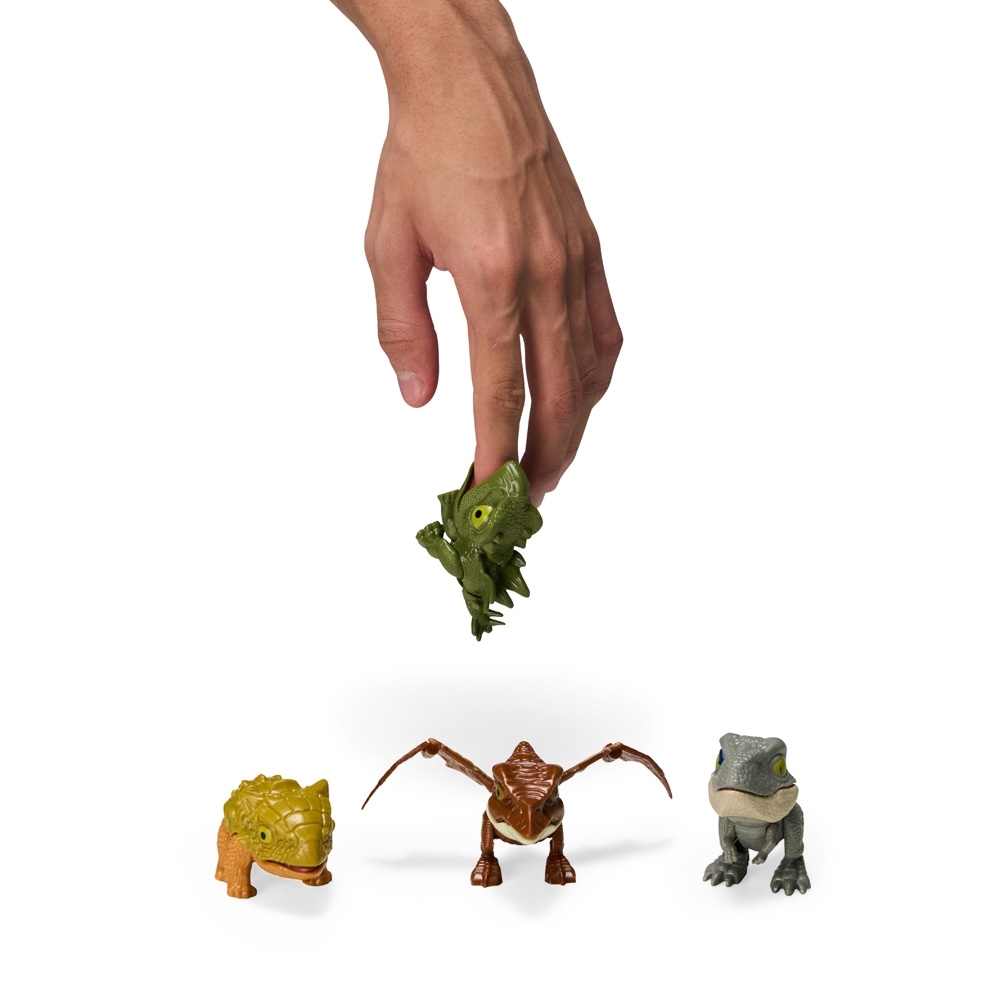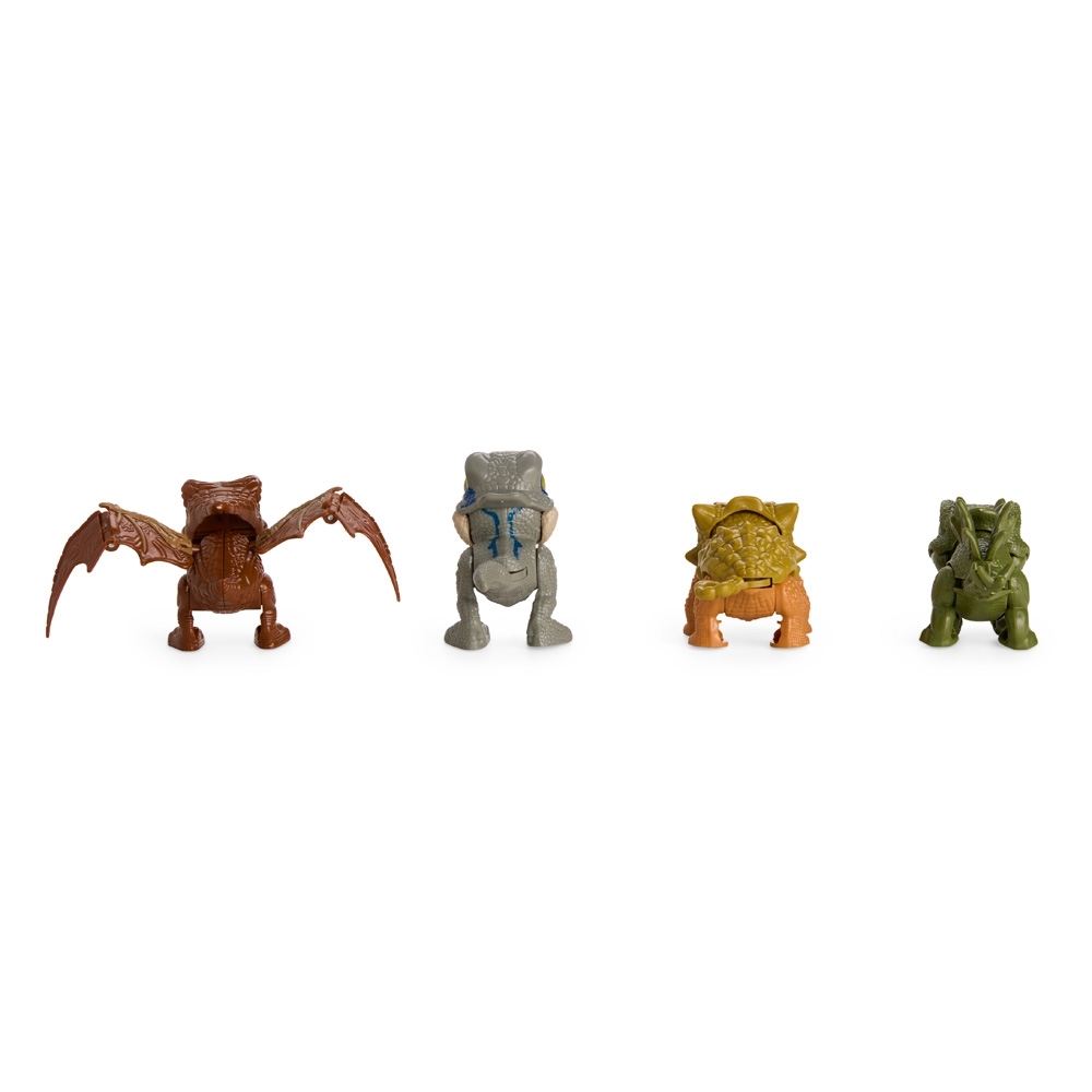 Kit com quatro dinossauros de brinquedo em plástico, cada um deles com articulações móveis, incluindo boca, pernas e cauda.