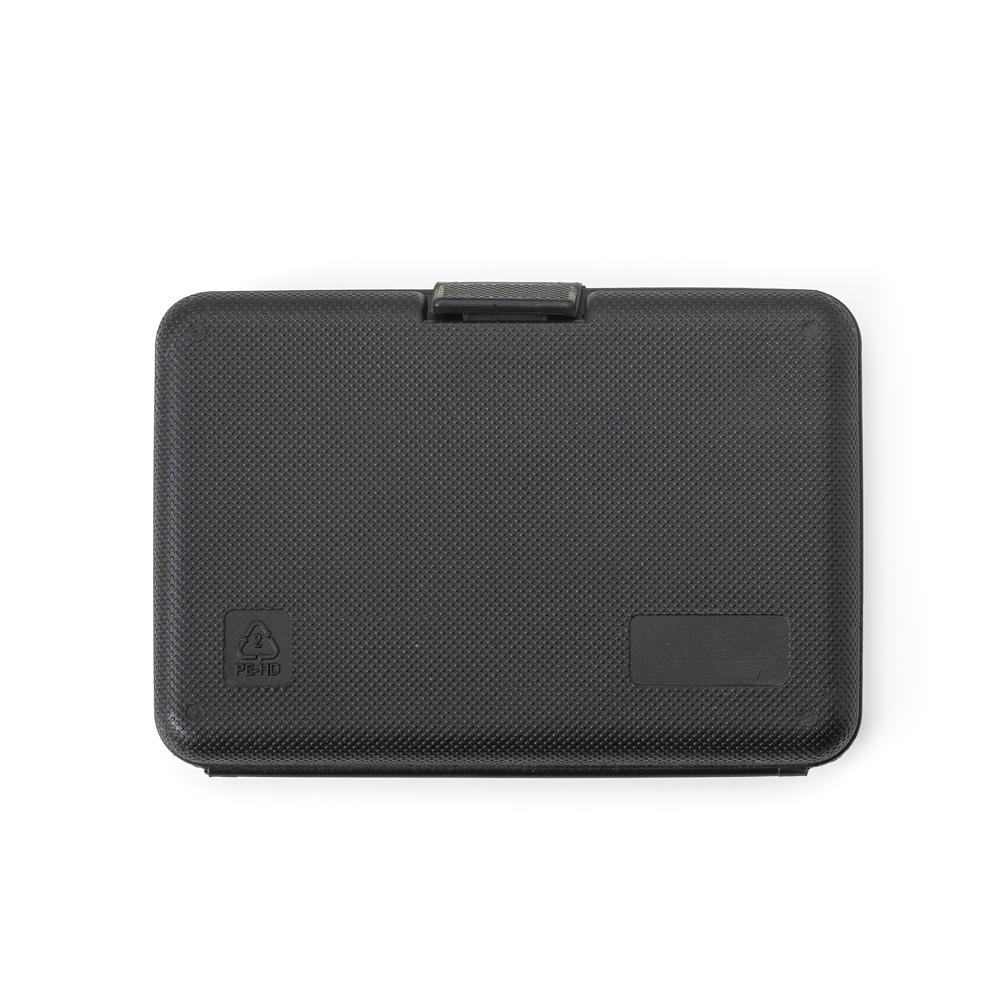 Kit ferramenta 11 peças em estojo plástico. Maleta plástica com detalhe retangular no centro frontal e verso com o detalhe na lateral inferior, possui texturização no estojo e uma trava superior. Acompanha: conjunto de 5 chaves Allen, trena de 1 metro, chave teste, estilete, chave Philips, chave de fenda e alicate.