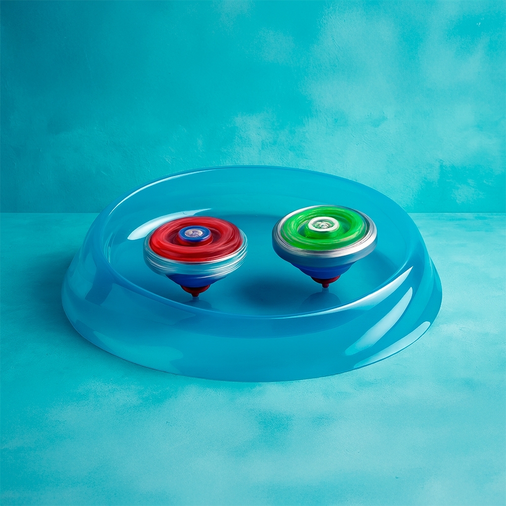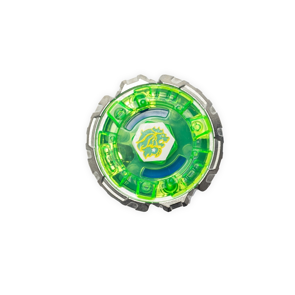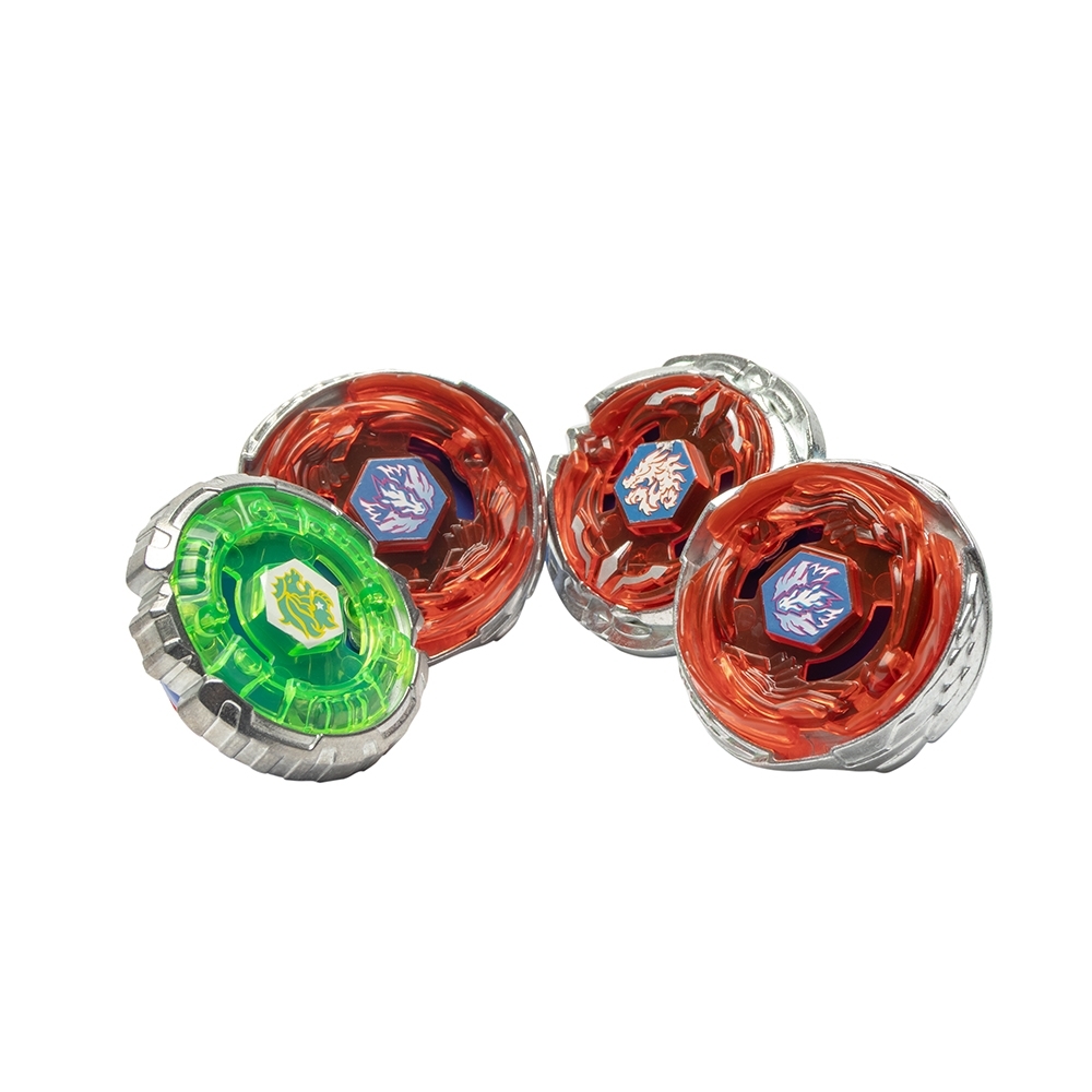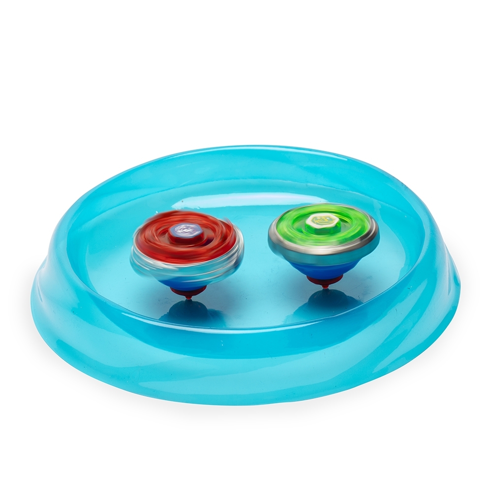 Kit com quatro piões metálicos com detalhes em plástico e iluminação em LED ativada durante o giro. Acompanha dois lançadores e uma arena circular, ambos em plástico.
