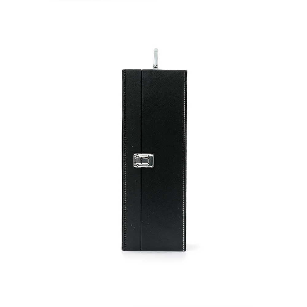 Kit vinho 4 peças em maleta de couro sintético. Contém saca-rolhas metálico, bico condutor com tampa, cortador de lacre e wine colar. Maleta com alça, trava de segurança e parte interna revestida de veludo com área de acomodação para garrafa.