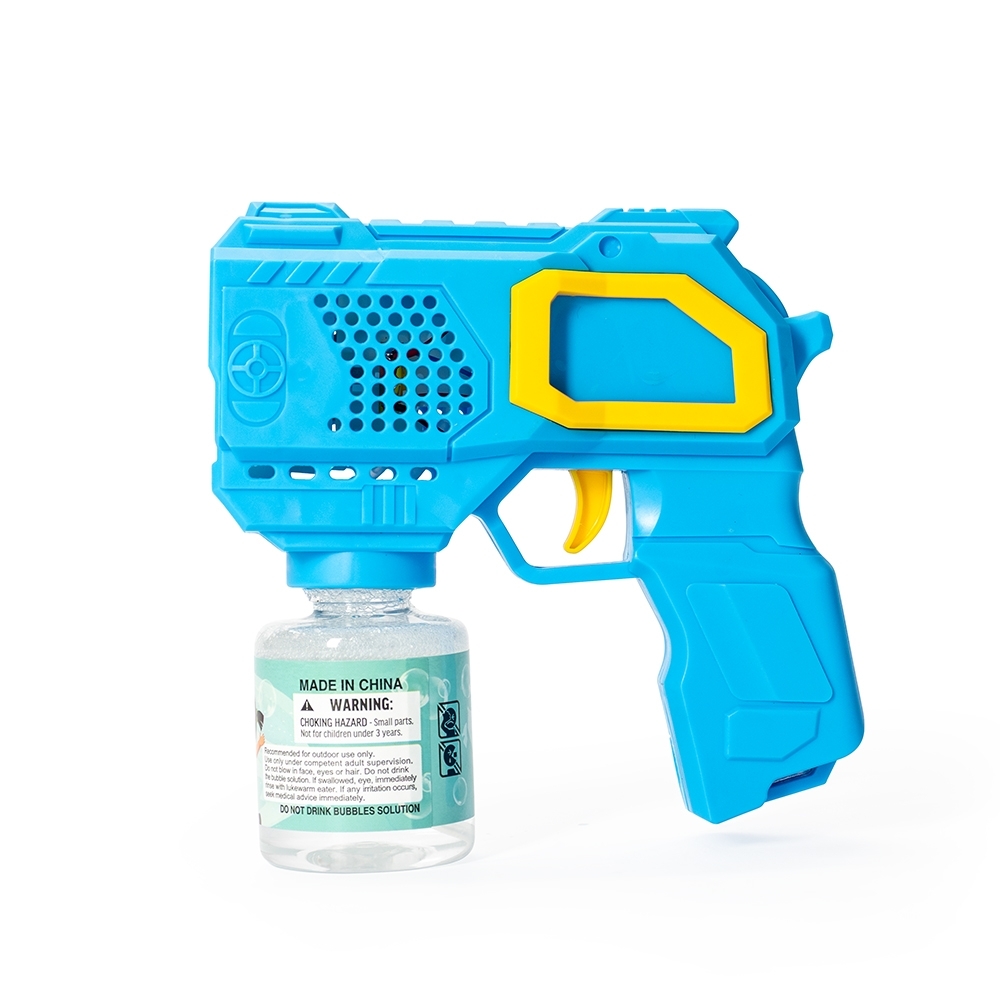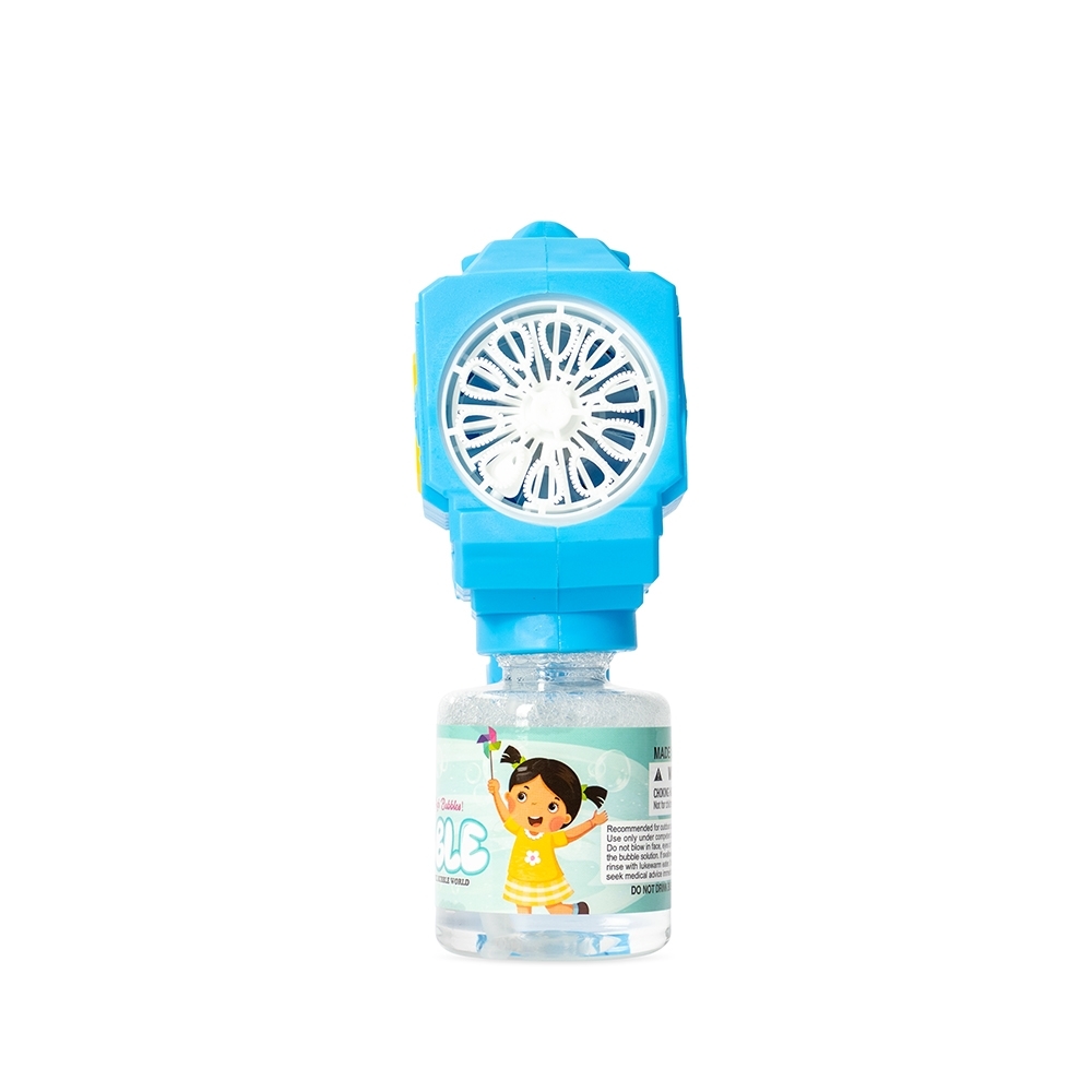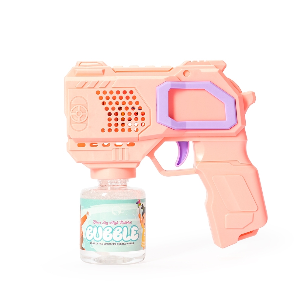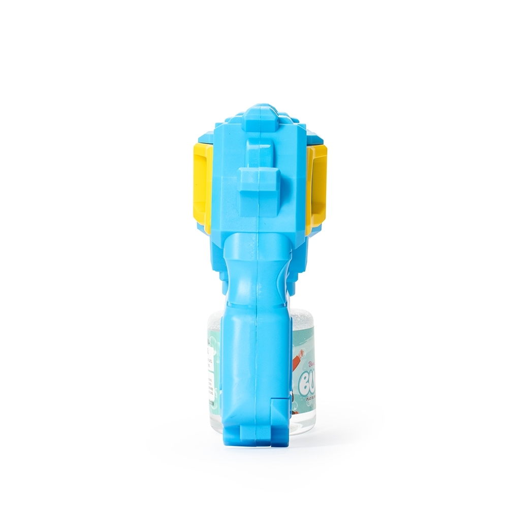 Brinquedo lançador de bolhas de sabão feito em plástico. Ao acionar o gatilho, dispara múltiplas bolhas de uma só vez. Funciona com quatro pilhas AA (não inclusas) e acompanha frasco com líquido para formar bolhas e adesivos para decoração.