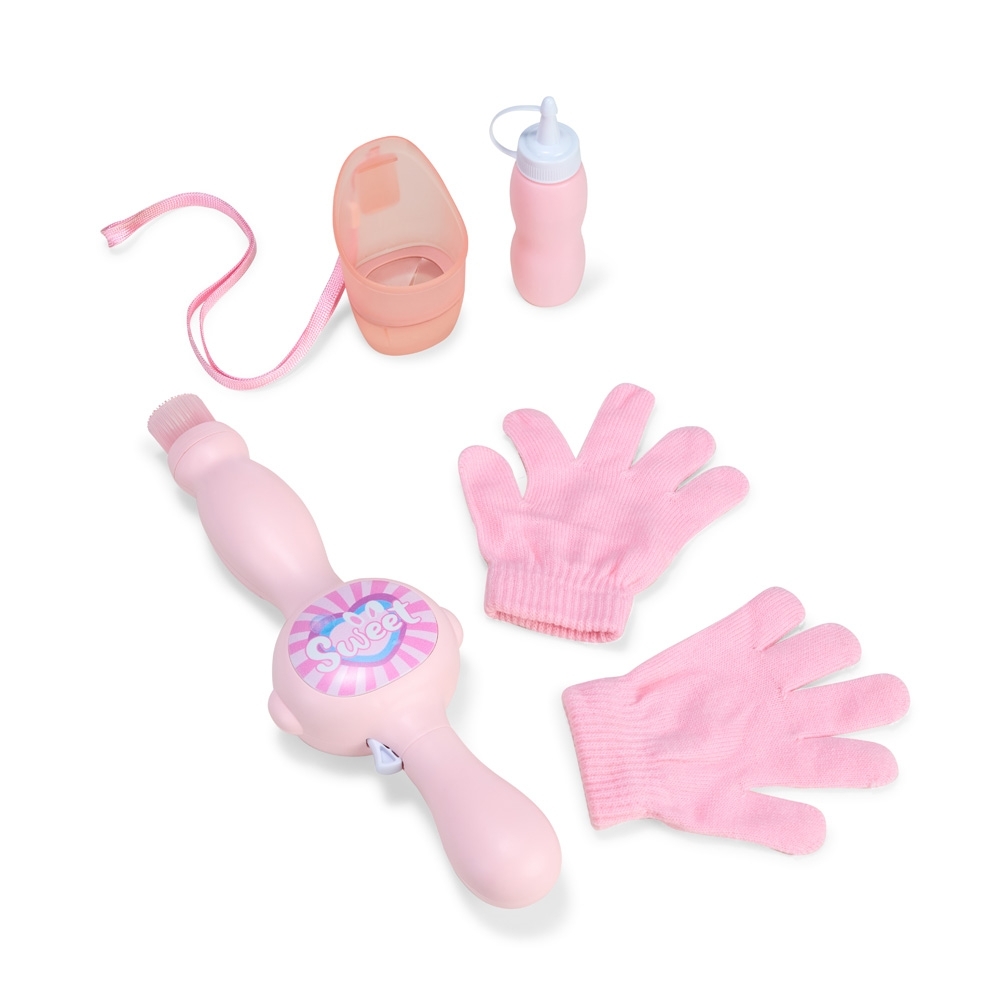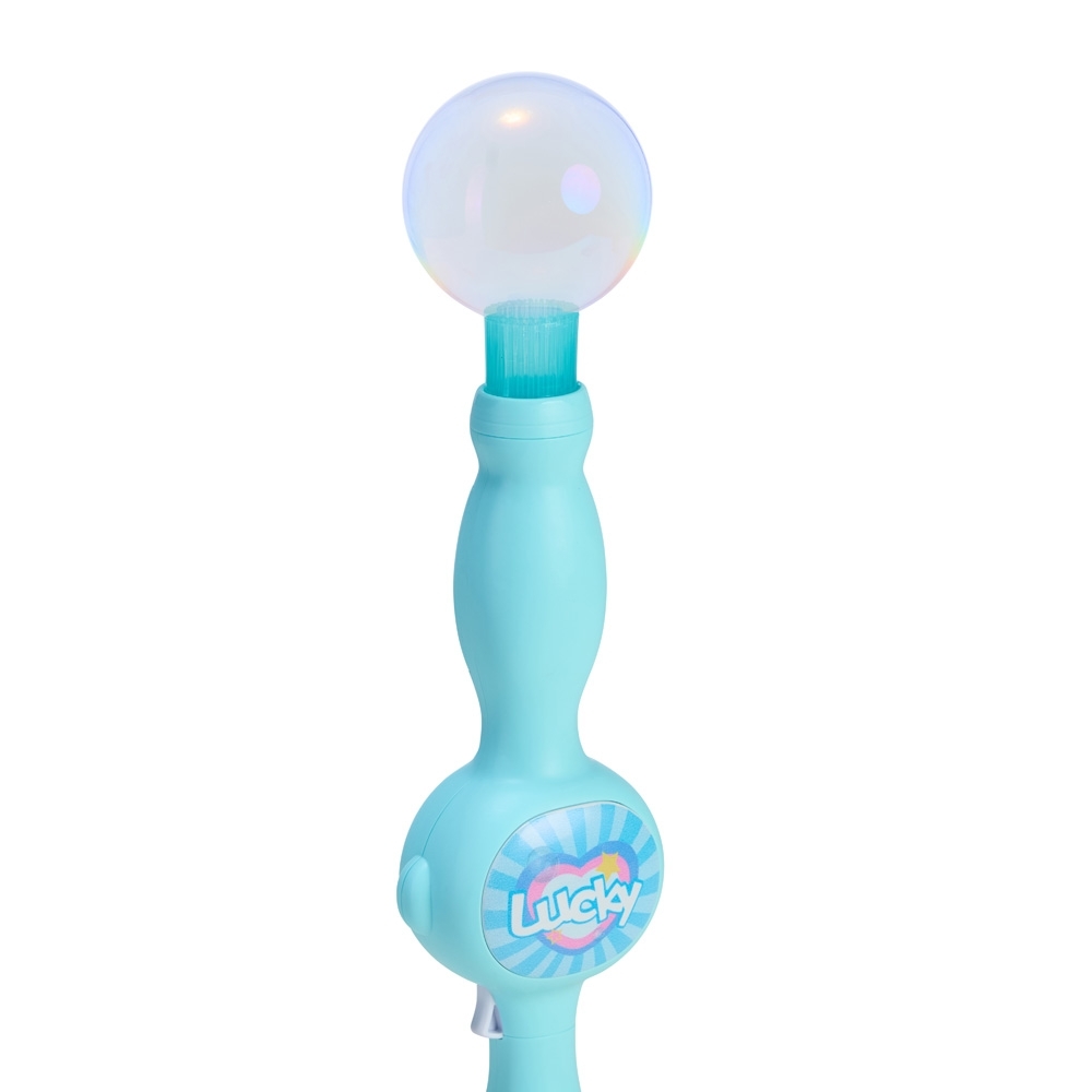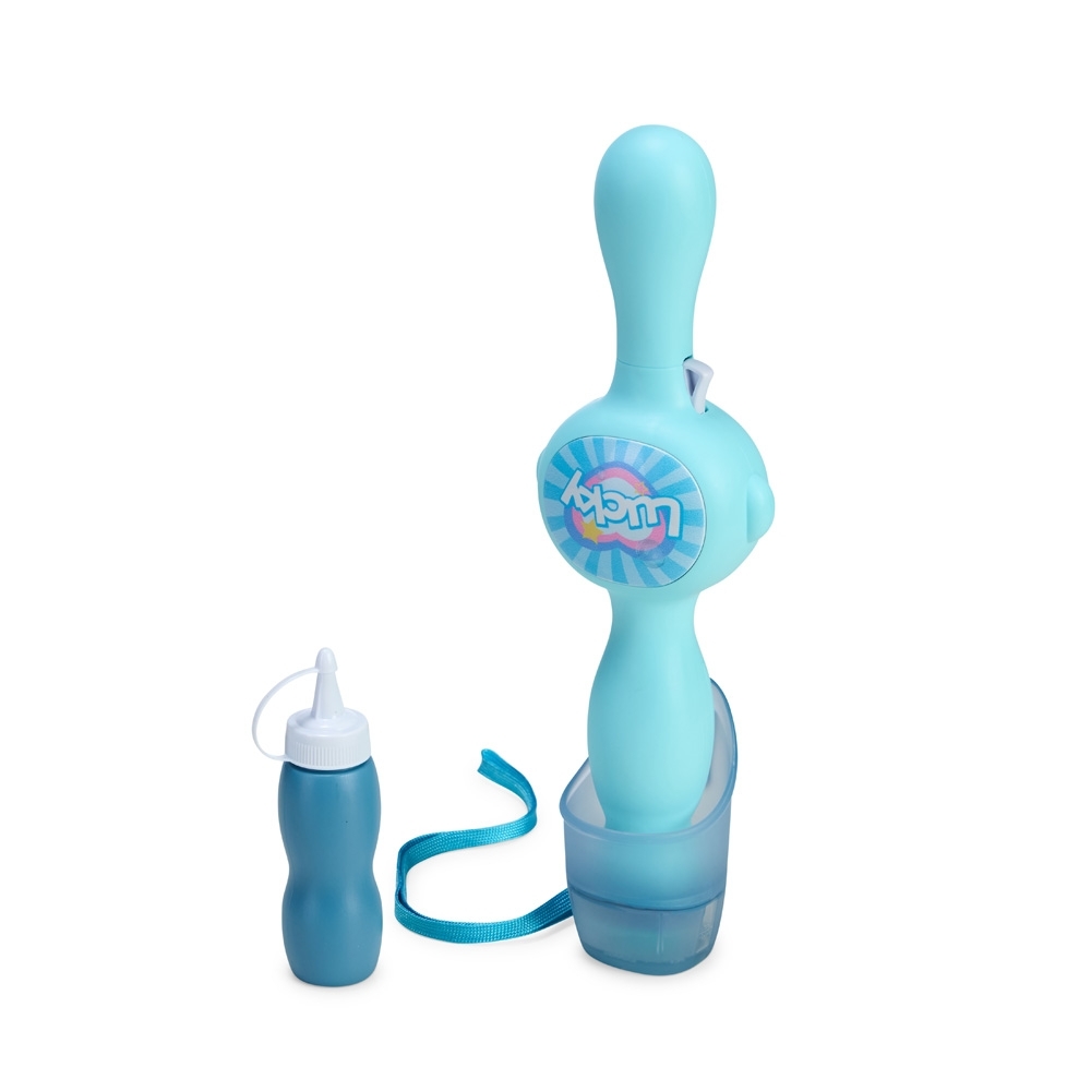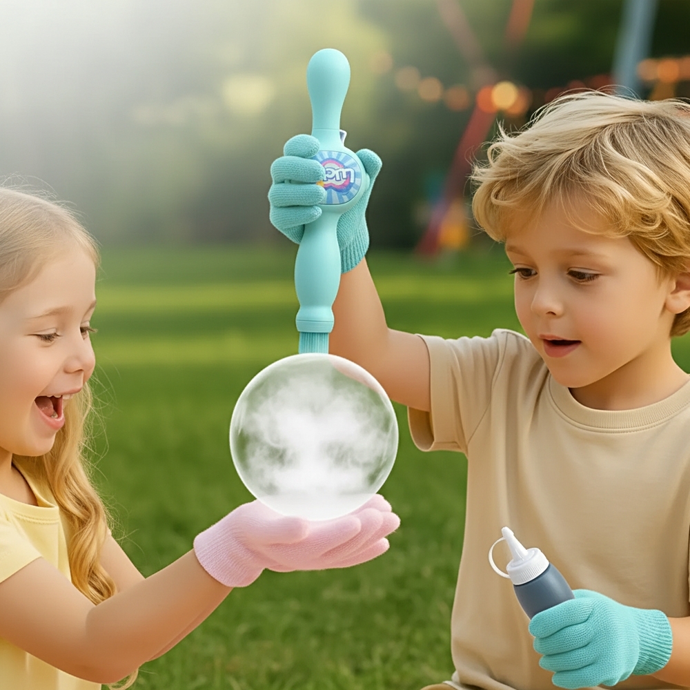 Lançador de bolhas de sabão com estrutura feita em plástico. Possui acionamento por gatilho que emite luz e música enquanto dispara bolhas de fumaça, formadas quando o líquido entra em contato com o atomizador. Acompanha frasco de solução para bolhas, um atomizador, um recipiente plástico, bateria 3.7v, recarregável, par de luvas e alça removível em nylon.
