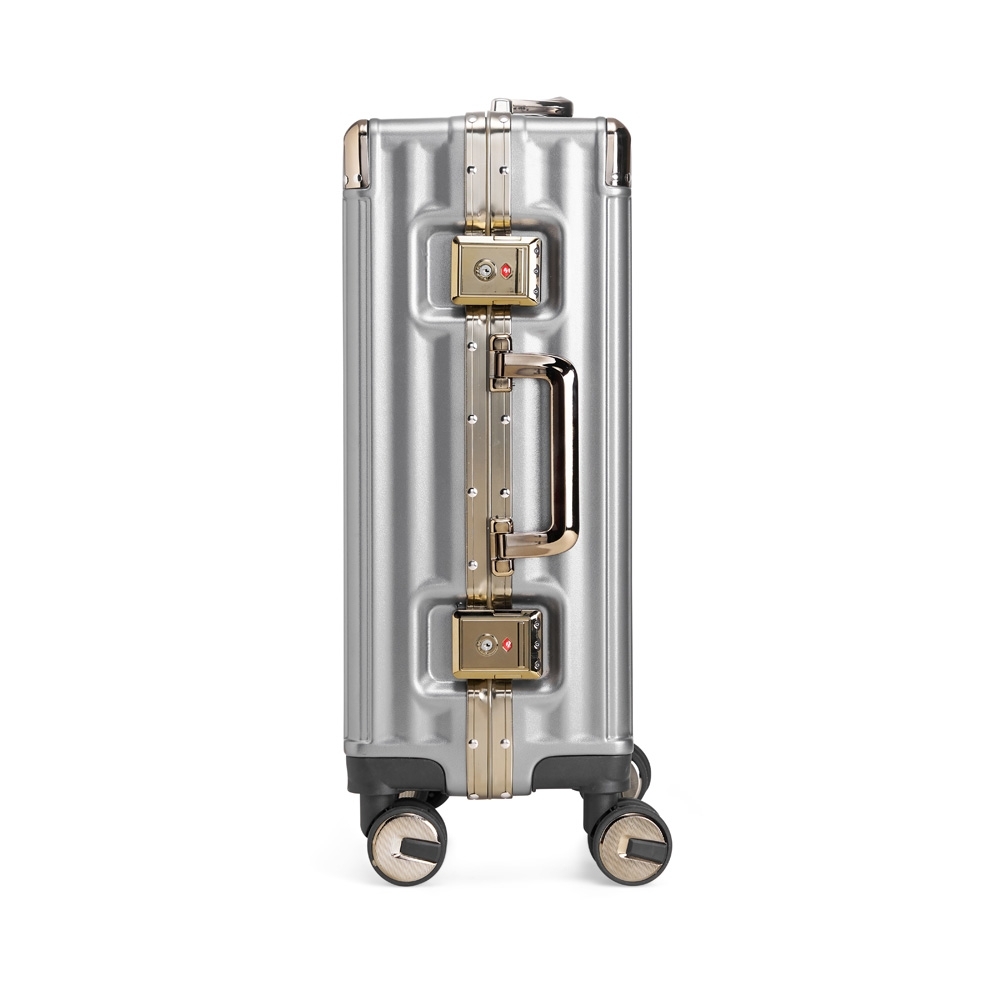 Mala de viagem 39 litros feita em plástico com acabamento em alumínio, contém cadeado numérico TSA. Compartimentos internos com bolso telado, bolso plástico para itens molhados e cinta compressora para roupas. A mala possui duas alças de mãos, puxador retrátil com regulagem de tamanho, suporte porta bolsa, quatro rodinhas 360º e apoios laterais.