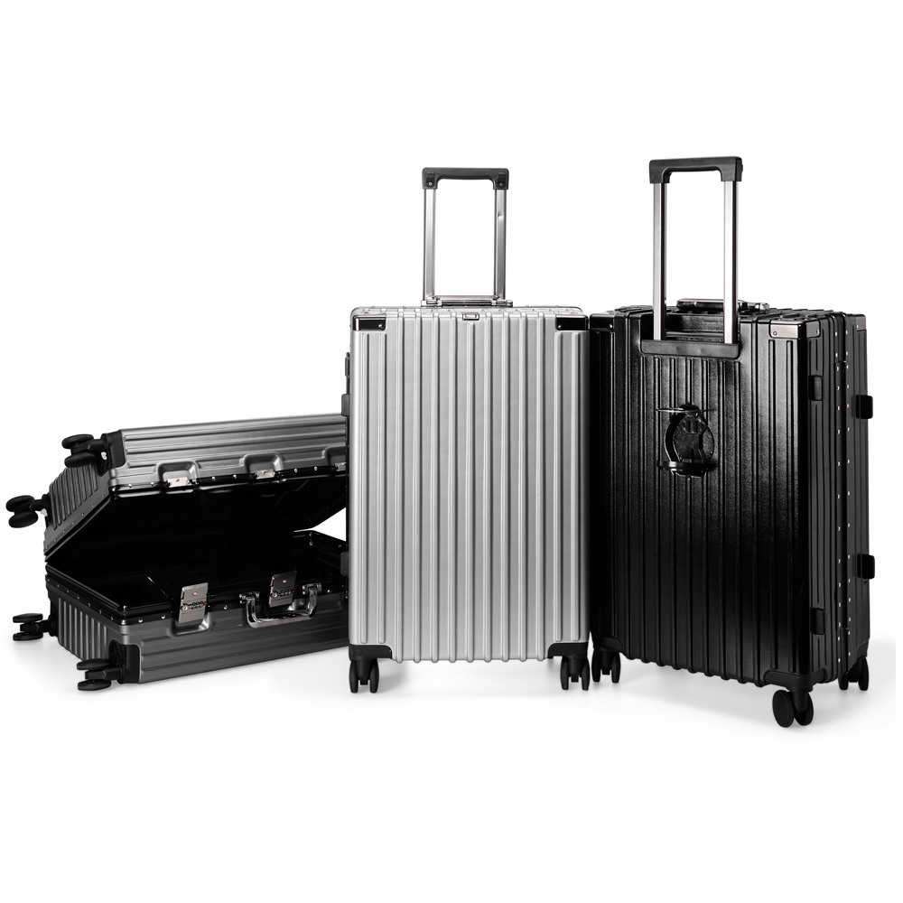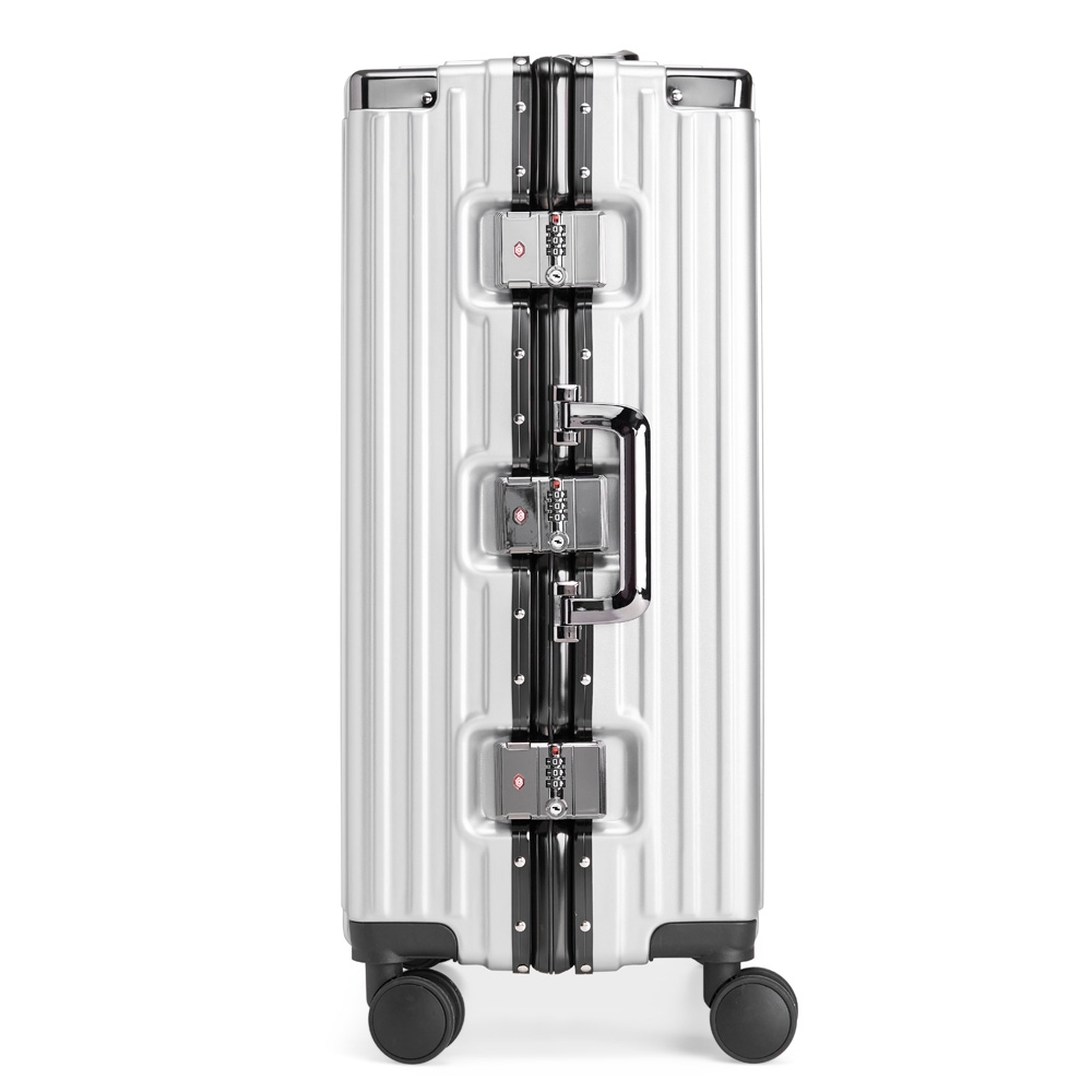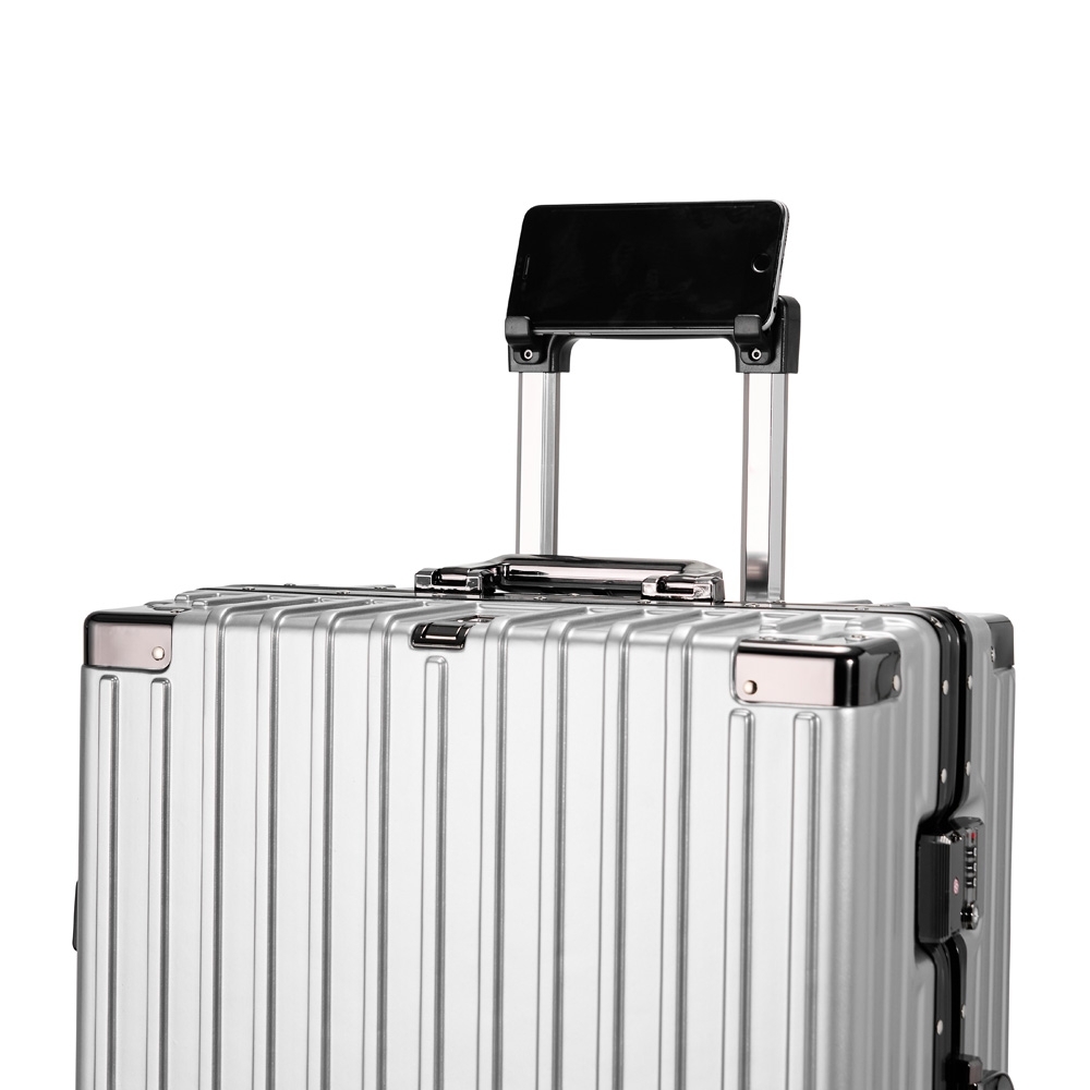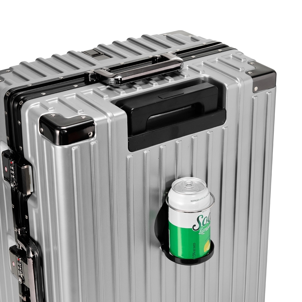 Mala de viagem 77 litros feita em plástico com acabamento em alumínio, contém cadeado numérico TSA. Compartimentos internos com bolso telado, bolso plástico para itens molhados e cinta compressora para roupas. A mala possui duas alças de mãos, puxador retrátil com regulagem de tamanho e suporte para celular, suporte porta bolsa, suporte para copo ou garrafa, quatro rodinhas 360º e apoios laterais.
