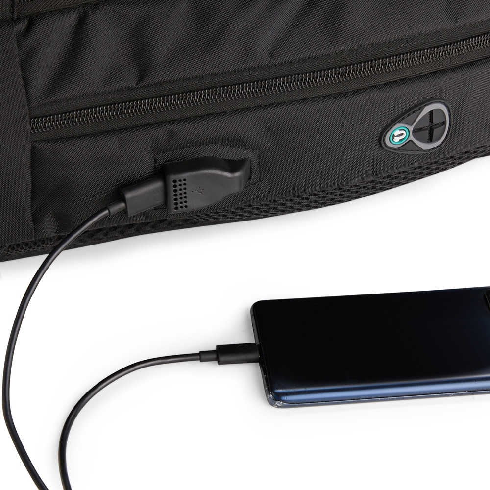 Mochila antifurto em poliéster impermeável, com capacidade de 16 litros e fechamento em zíper. Possui cadeado de segredo, entrada externa para cabo USB, passagem para fones de ouvido, três compartimentos de diferentes tamanhos, incluindo bolso frontal com divisória para notebook de até 15,6 polegadas e alça superior reforçada. Conta ainda com engate para malas, alças de costas e painel traseiro acolchoados.