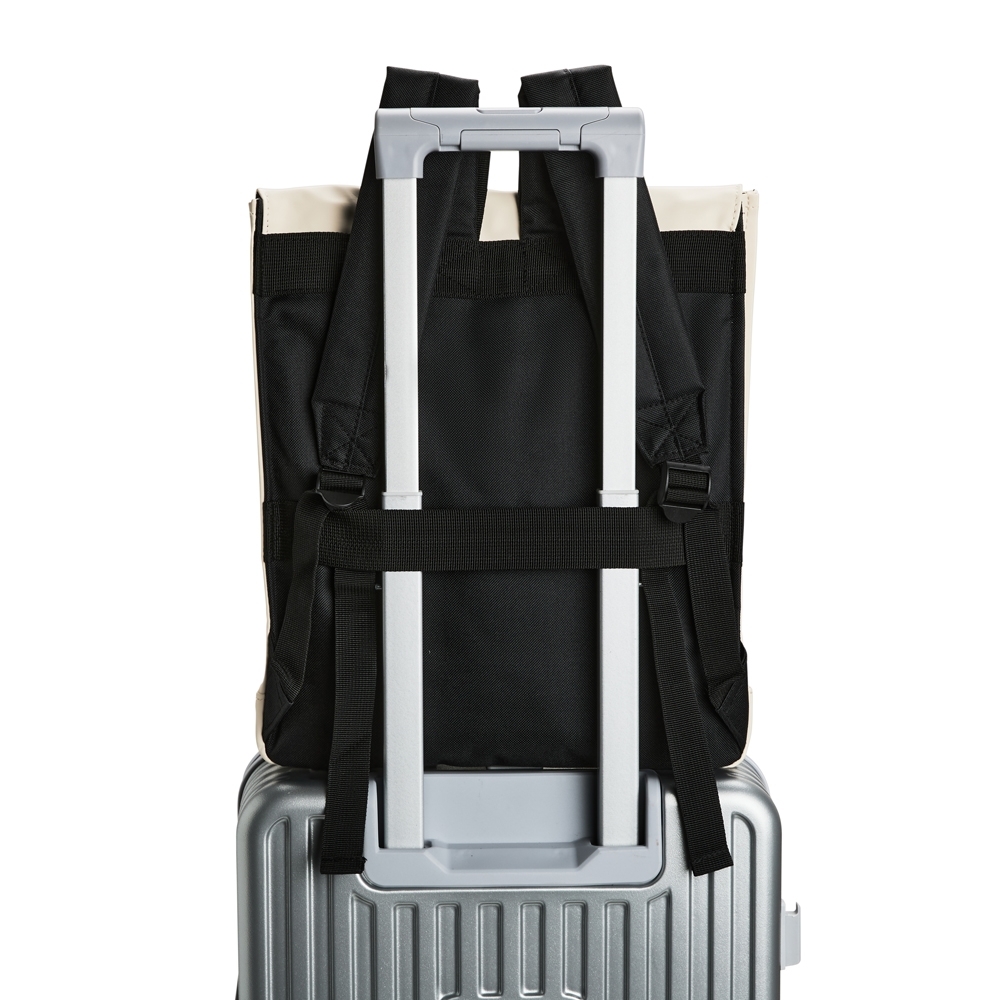 Mochila em couro sintético impermeável com capacidade de até 16 litros. Apresenta compartimento interno com bolso para notebooks de até 13 polegadas. Possui duas alças para as costas, alça de mão e engate posterior para mala de viagem.