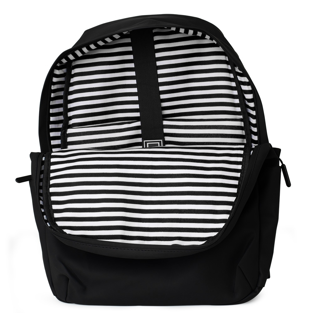 Mochila de couro sintético impermeável de 30 litros com três compartimentos, sendo o principal com bolso para notebook 15,6. Com bolsos laterais e interior listrado, a mochila possui alça para encaixe em malas de viagem, alça de mão e alças para as costas com revestimento espumado. Acompanha plaquinha metálica.