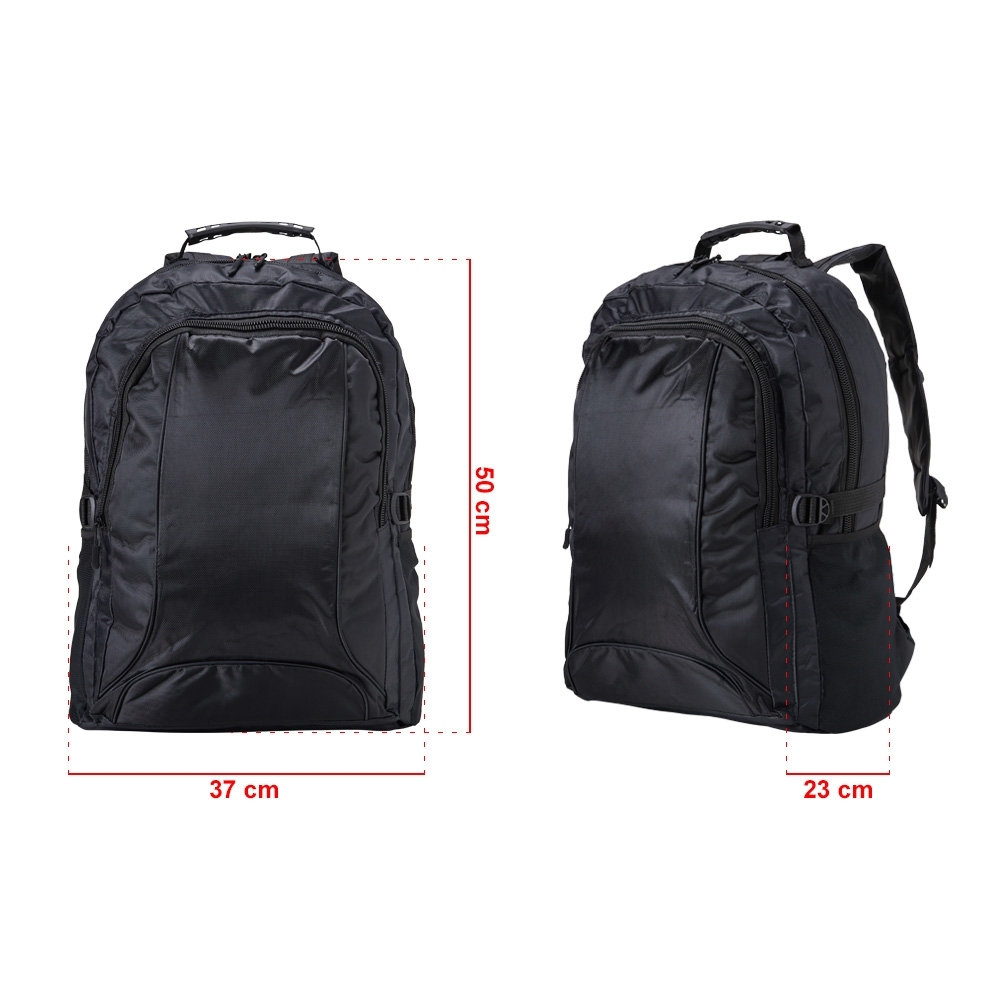Mochila de nylon 35 litros com dois compartimentos e bolsos laterais em malha. Possui fivelas laterais para regulagem de tamanho e duas alças de mãos, sendo uma delas reforçada com pegador plástico.