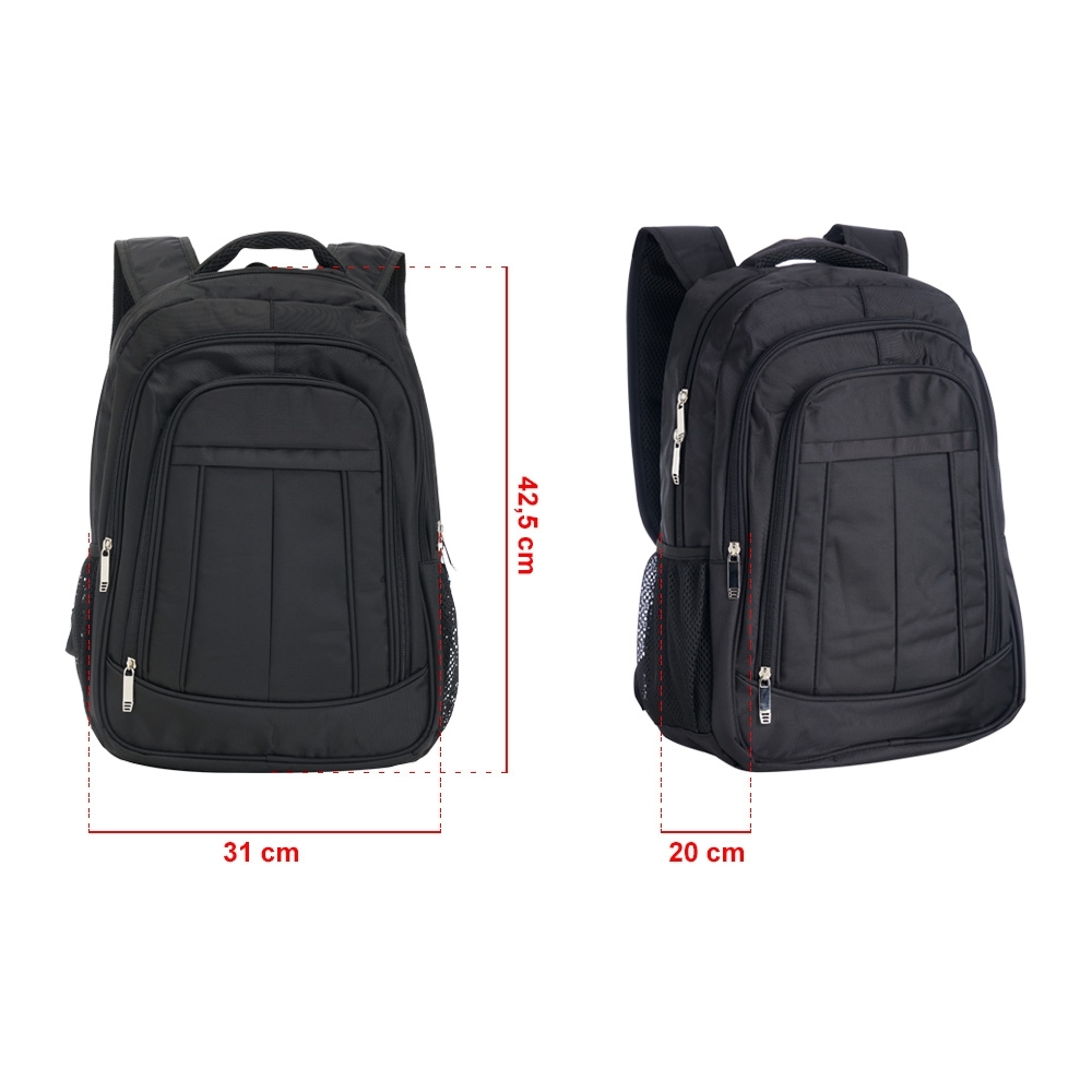 Mochila de poliéster 25 litros com três compartimentos, sendo o principal com bolso para notebook 15,6. A mochila possui bolsos laterais em malha, duas alças de mãos e área costada com revestimento espumado.