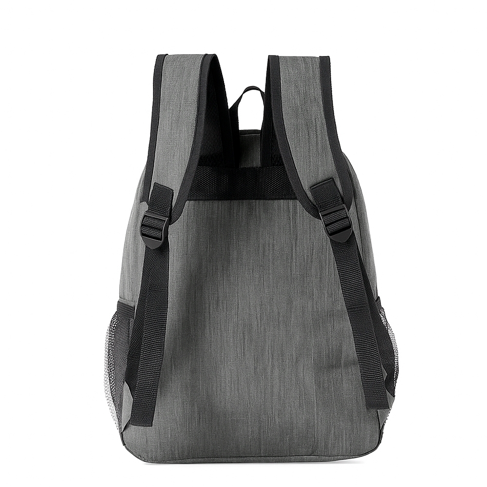 Mochila térmica de poliéster 15 litros com dois compartimentos e bolsos laterais em malha. Compartimento principal com revestimento térmico.