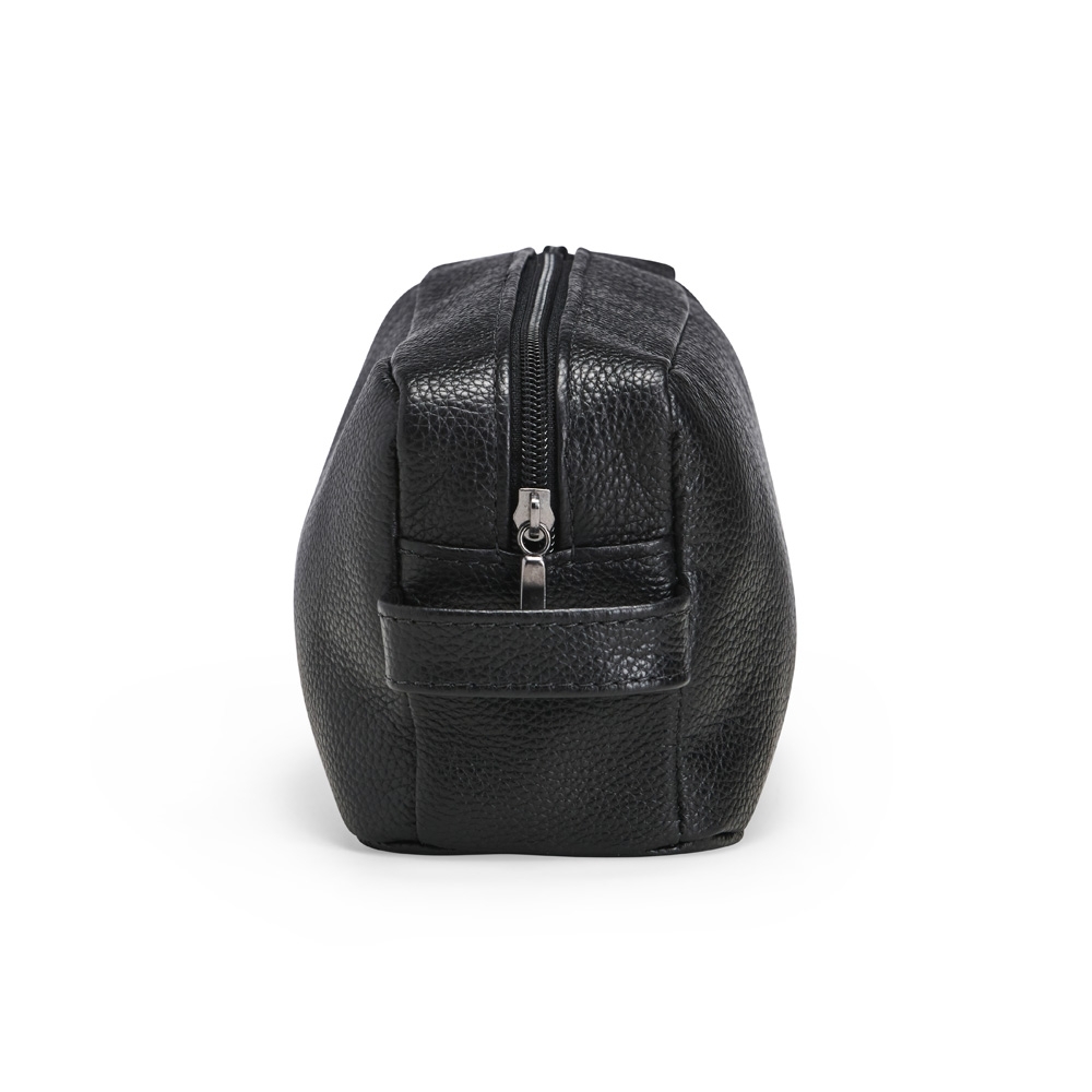 Nécessaire em couro, com fechamento em zíper, alça lateral de mão e plaquinha presa a cordão de nylon.