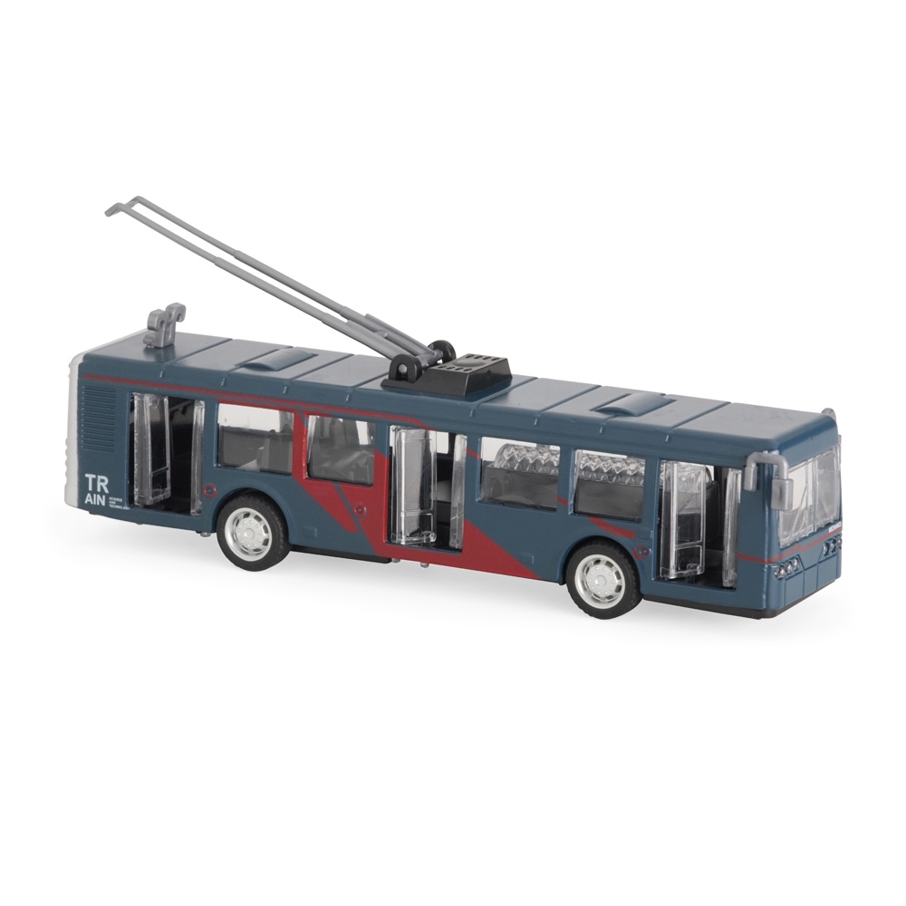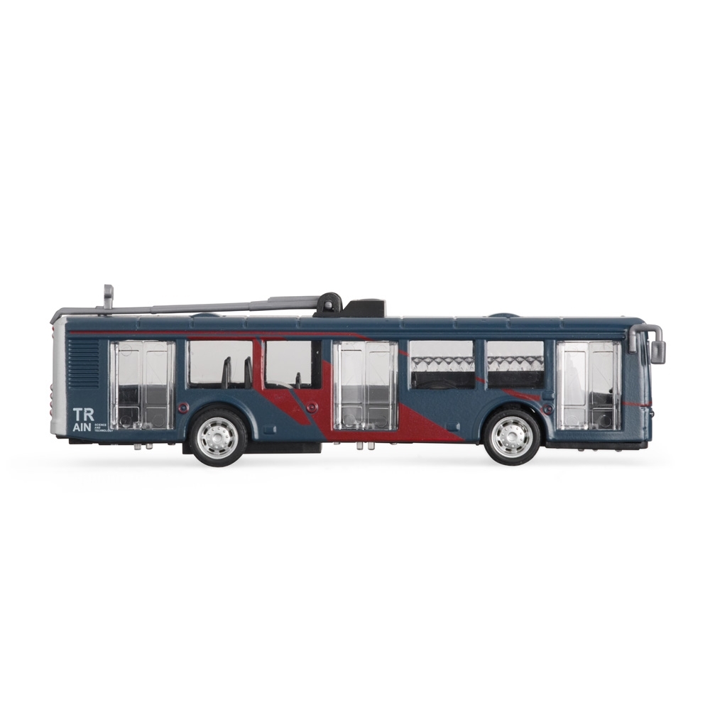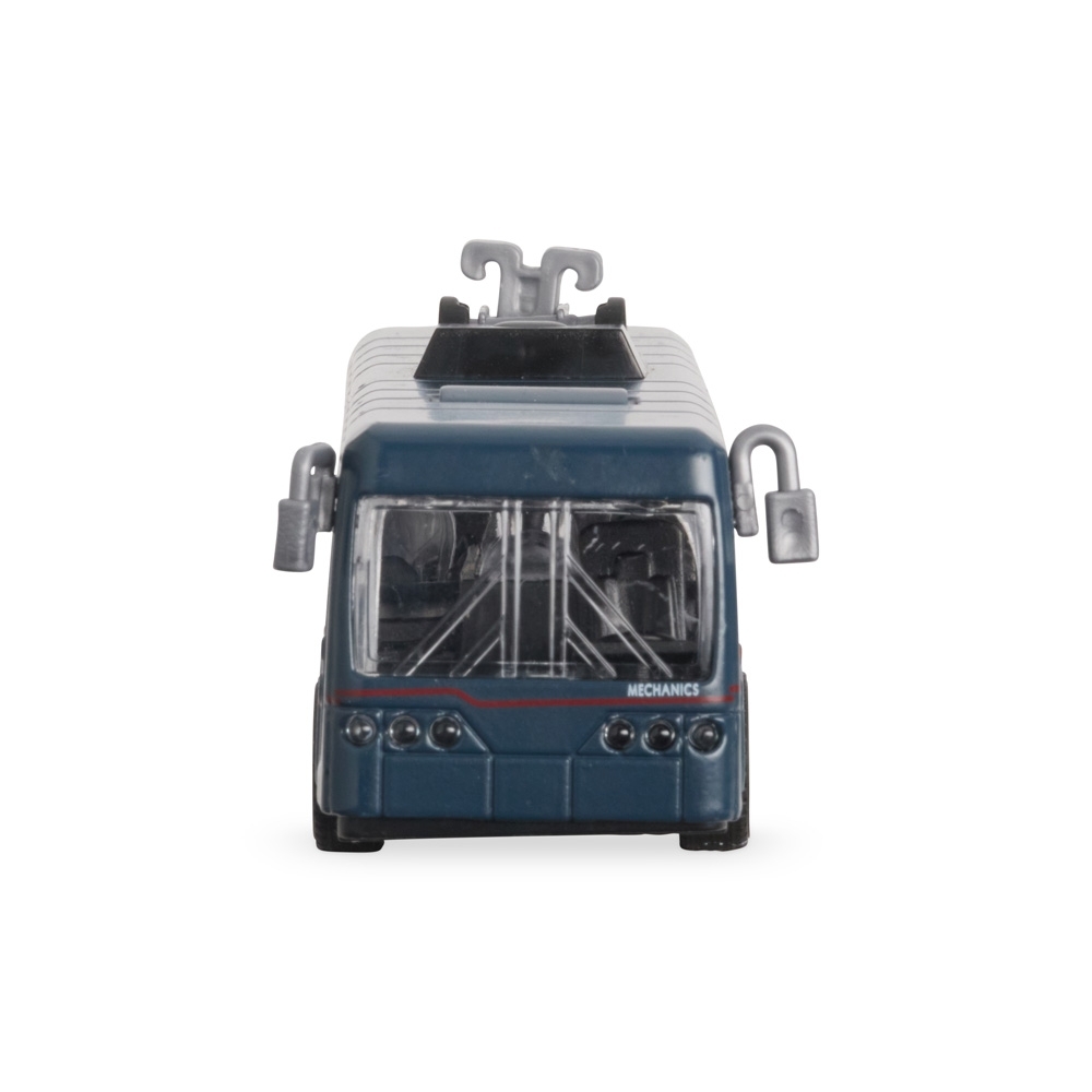 Ônibus em miniatura com estrutura feita em metal e plástico. Conta com pneus emborrachados, mecanismo de fricção nas rodas traseiras e portas com abertura funcional.