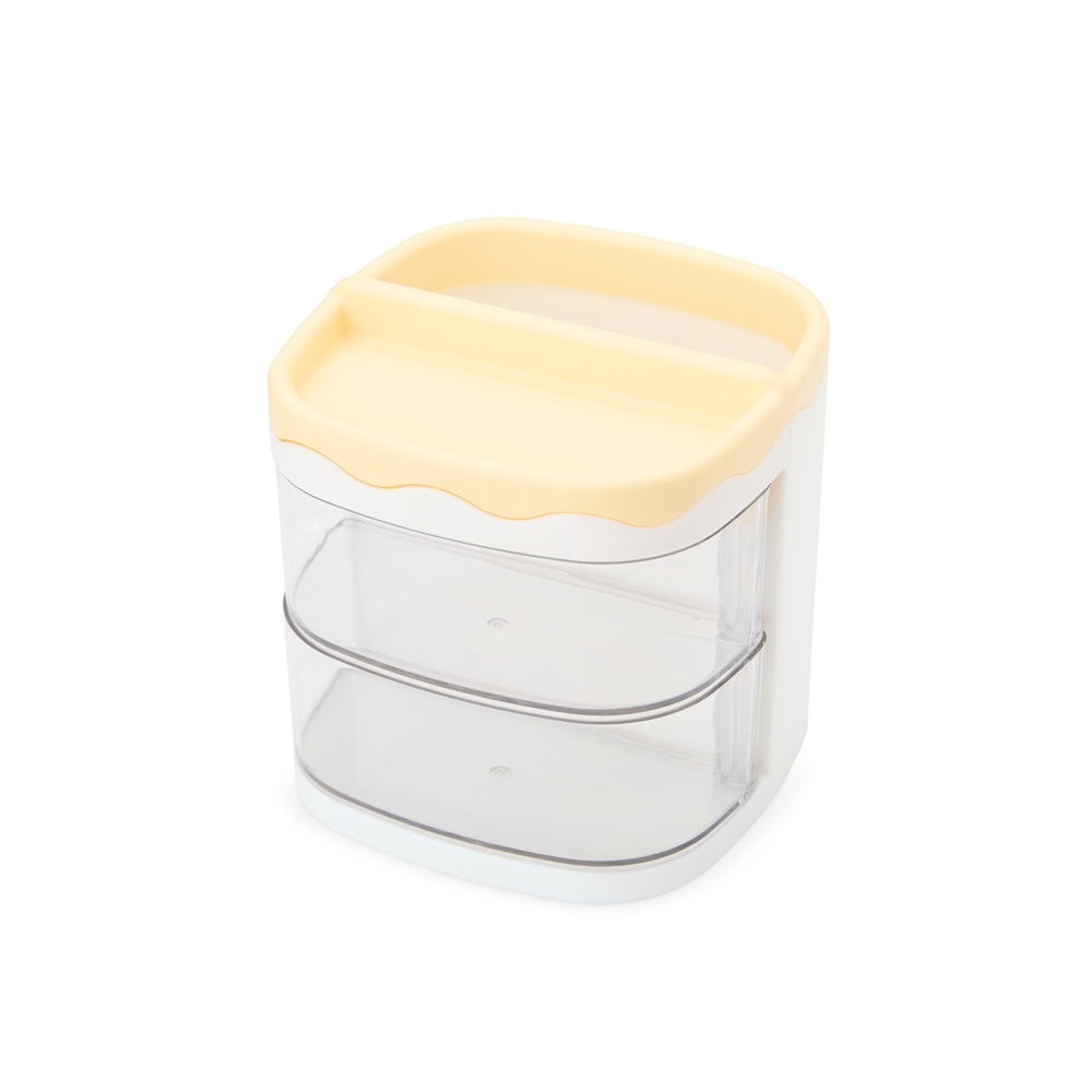 Deixe o espaço da mesa de estudo ou trabalho mais organizado, bonito e prático! Feito em plástico e acrílico, o organizador combina funcionalidade e um toque de beleza. Conta com 2 compartimentos versáteis para lápis, pincéis de maquiagem, canetinhas coloridas ou o que mais desejar, além de um espaço raso para itens como borracha e outros acessórios. Também possui 2 gavetas para objetos diversos, como cola, clipes, mini grampeadores e muito mais. Com este organizador de mesa, é possível usar a criatividade para organizar e decorar.