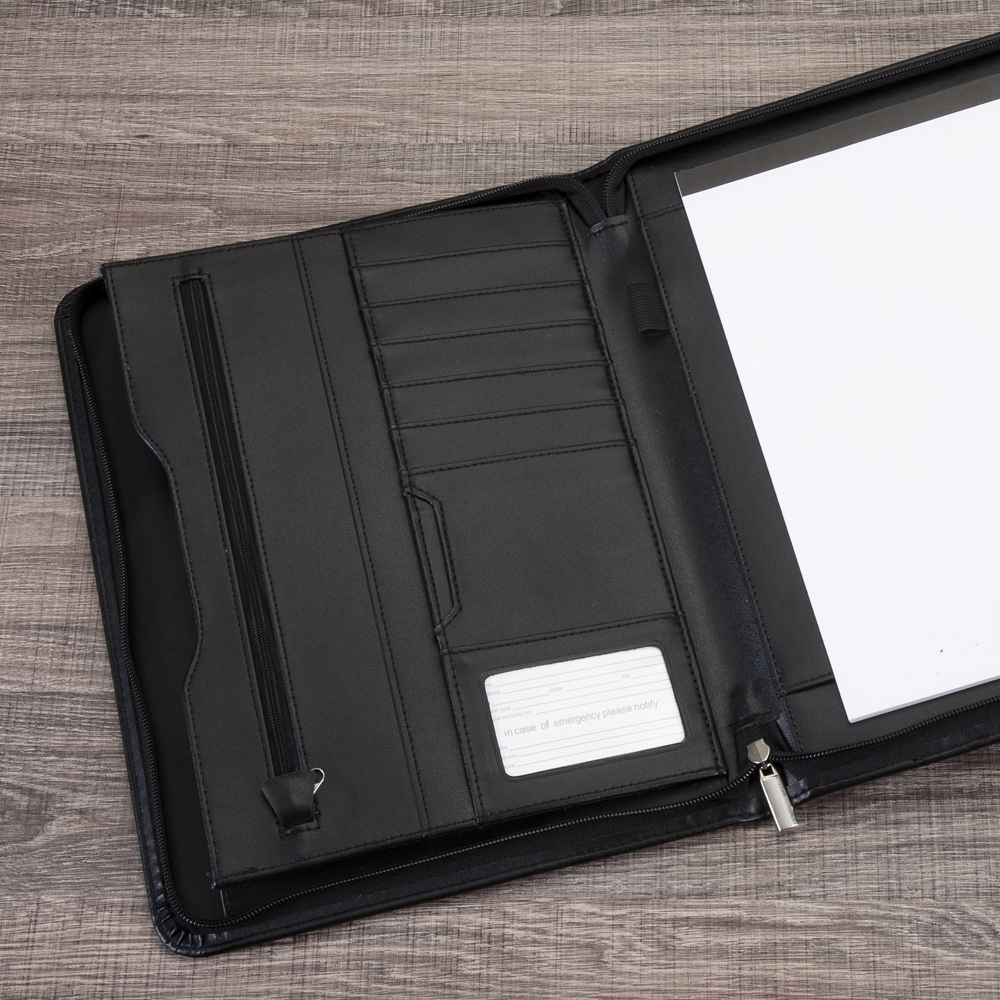 Pasta convenção de couro sintético com zíper, possui 2 compartimentos grandes para arquivar documentos, compartimento interno com zíper, 7 divisórias pequenas para documentos, suporte com visor para cartão de identificação, suporte para caneta(não acompanha caneta) e bloco com 20 folhas pautadas.
