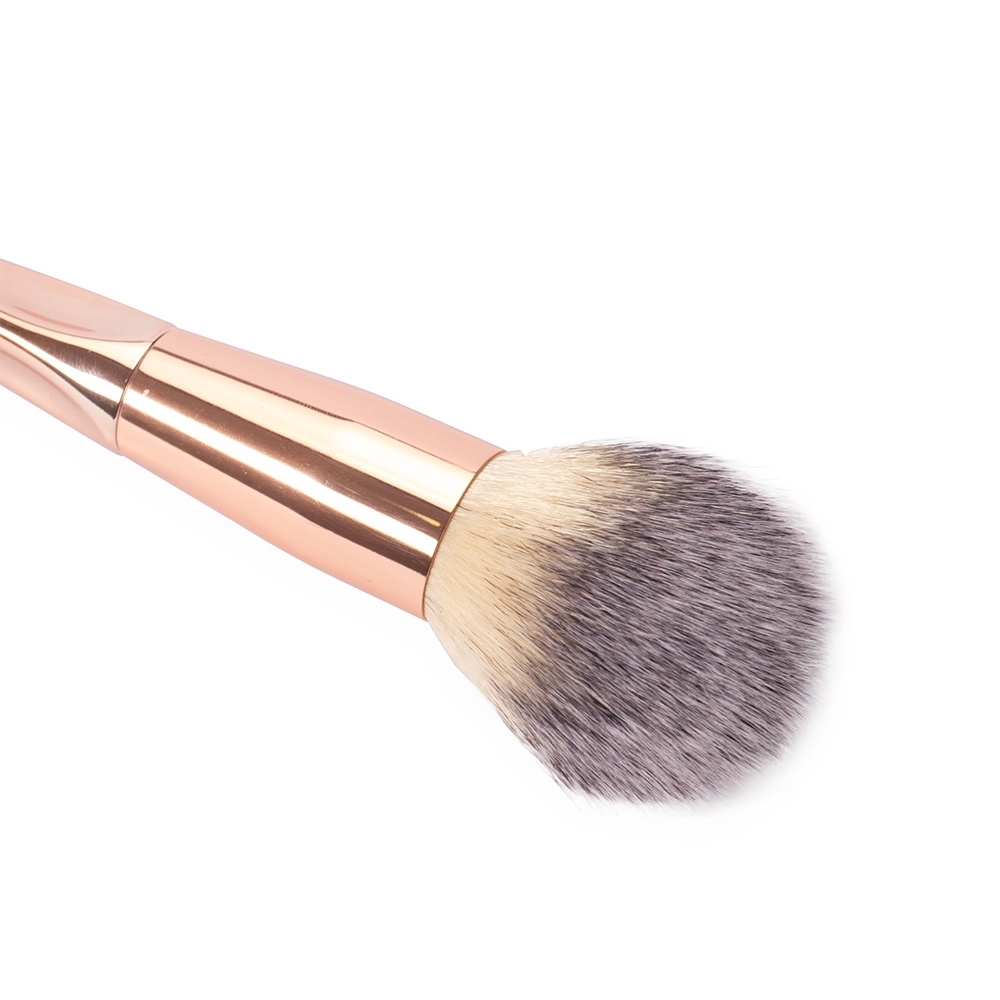 Pincel de maquiagem com cerdas sintéticas macias e cabo ergonômico feito em plástico, ideal para a aplicação de pó compacto no rosto.