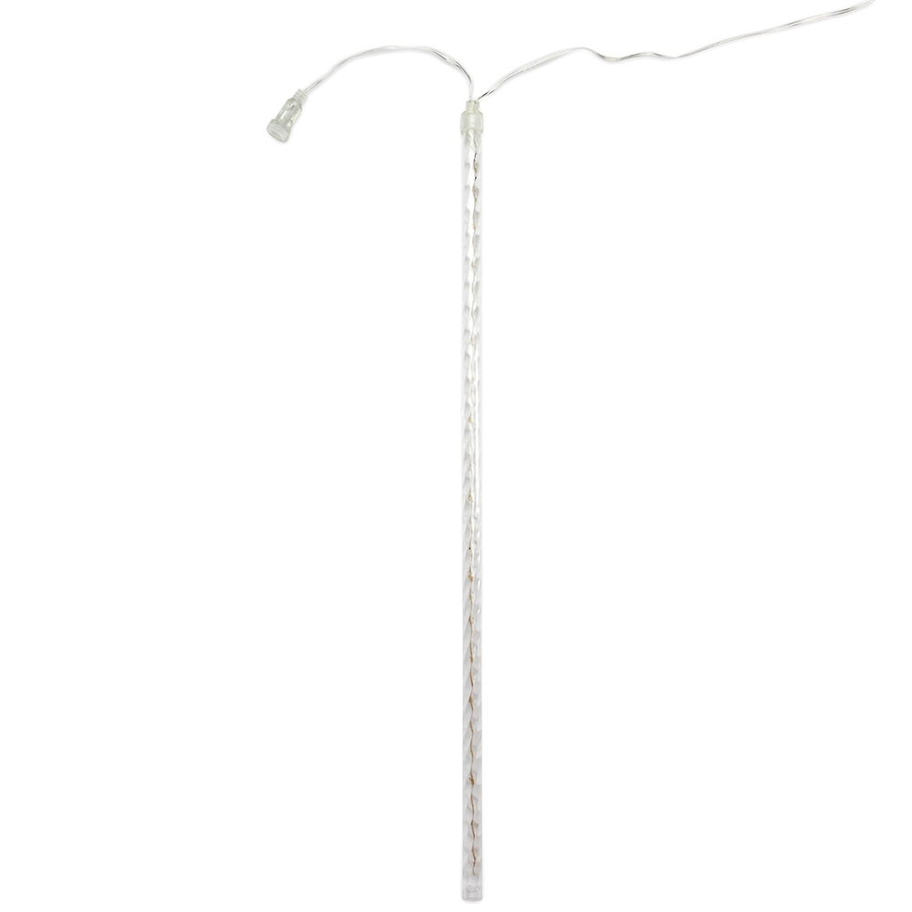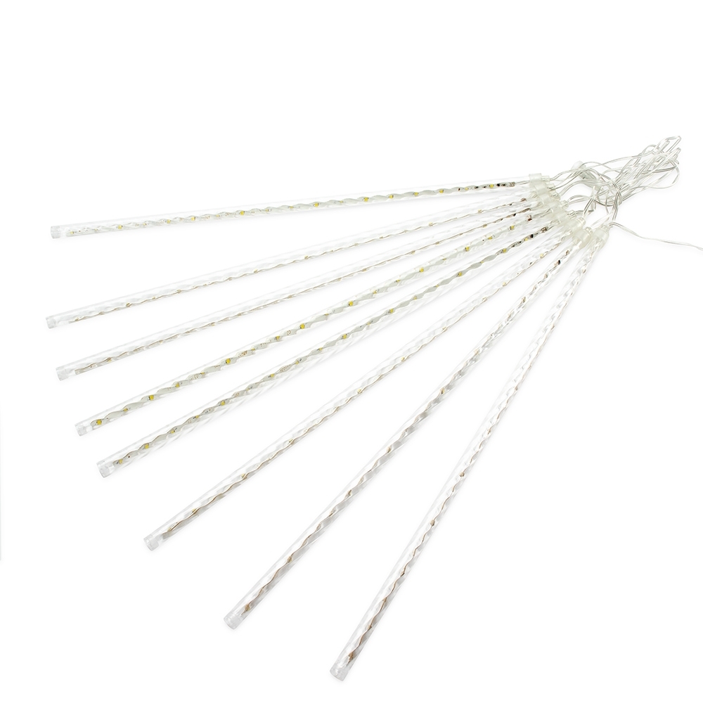 Pisca-pisca de LED formado por oito tubos interligados entre si com estrutura em plástico e efeito de iluminação em chuva de meteoros. Dispõe de cabo de alimentação bivolt e adaptador que permite ligação a outros conjuntos de tubos.