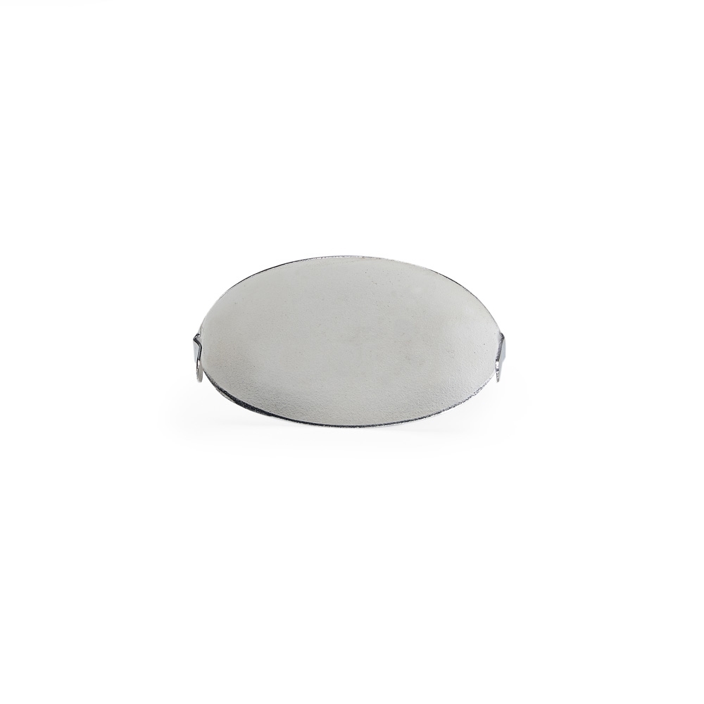 Plaquinha metálica oval para personalização. Possui hastes com ponta na parte traseira.