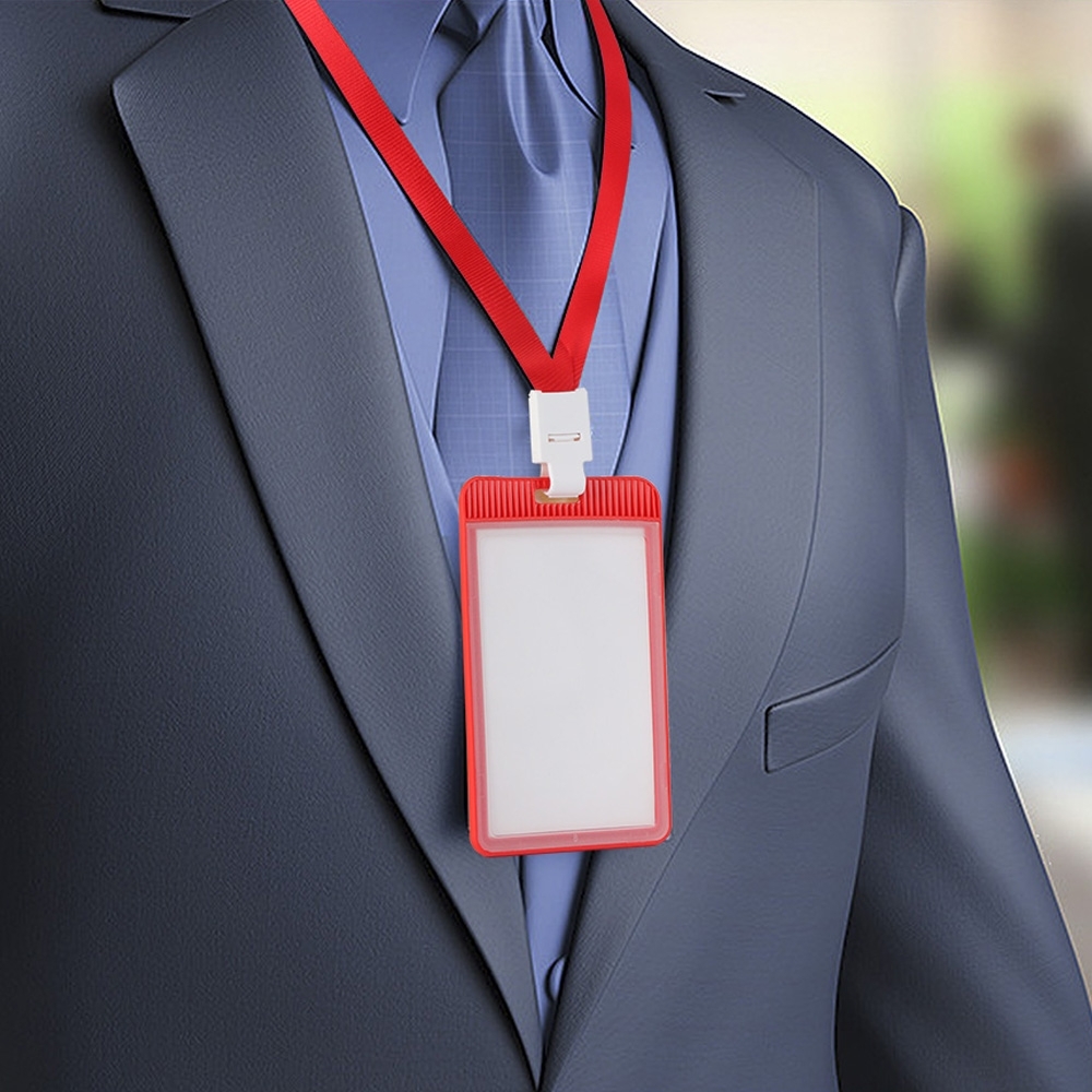 Porta crachá ou porta credencial em plástico resistente. Suporte com visor transparente removível e abertura superior para prender o cordão.