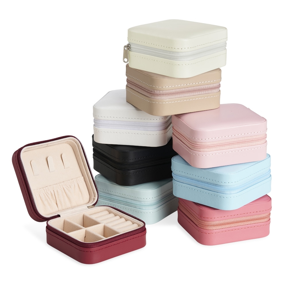 Porta-joias feito em couro sintético com revestimento interno em tecido aveludado. Possui bolso elástico e três ganchos pequenos na parte interna da tampa, além de divisória multiuso e repartição almofadada com ranhuras para anéis, ambos localizadas no compartimento principal.