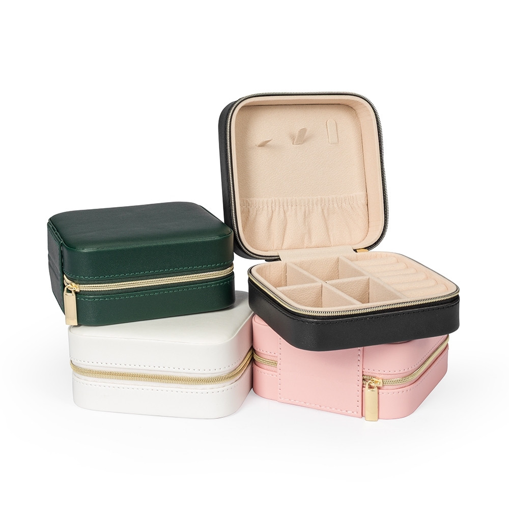 Porta-joias feita em couro sintético com revestimento aveludado e fechamento em zíper. Possui três ganchos pequenos e um bolso com elástico na parte interna da tampa, além de divisória removível com quatro compartimentos e um espaço estofado com ranhuras, ideal para organizar brincos e anéis.