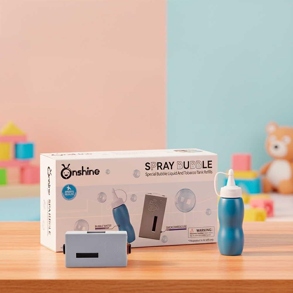 Refil para bolhas de sabão com efeito de fumaça. O conjunto é formado por um frasco de líquido para bolhas de sabão e um atomizador responsável pela geração da fumaça.