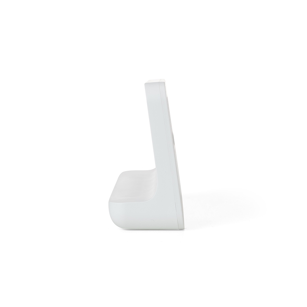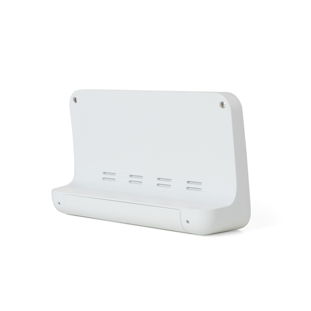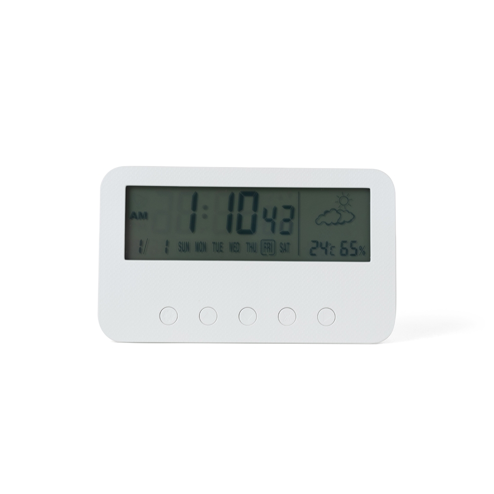 Relógio digital com alarme. Produzido em plástico, o relógio possui um display LCD com exibição das horas, dias da semana, data, alarme, relógio de contagem progressiva e regressiva, temperatura, clima e umidade, parte frontal inferior com botões para ajustes, e parte traseira com compartimento para 2 pilhas AAA (não acompanha). Acompanha manual de instruções em inglês