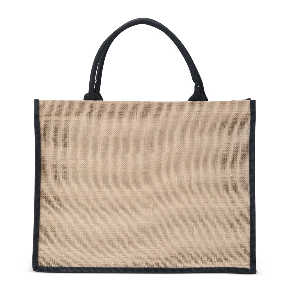Sacola ecológica confeccionada em juta com alças costuradas na parte interna.