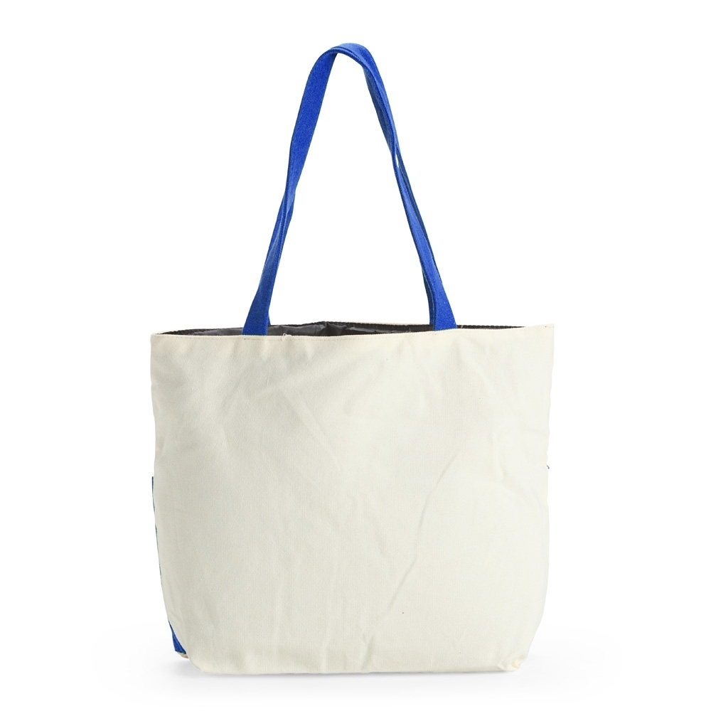 Sacola confeccionada em lona 356g/m² com revestimento interno em poliéster, bolso frontal aberto e duas alças com costura interna.