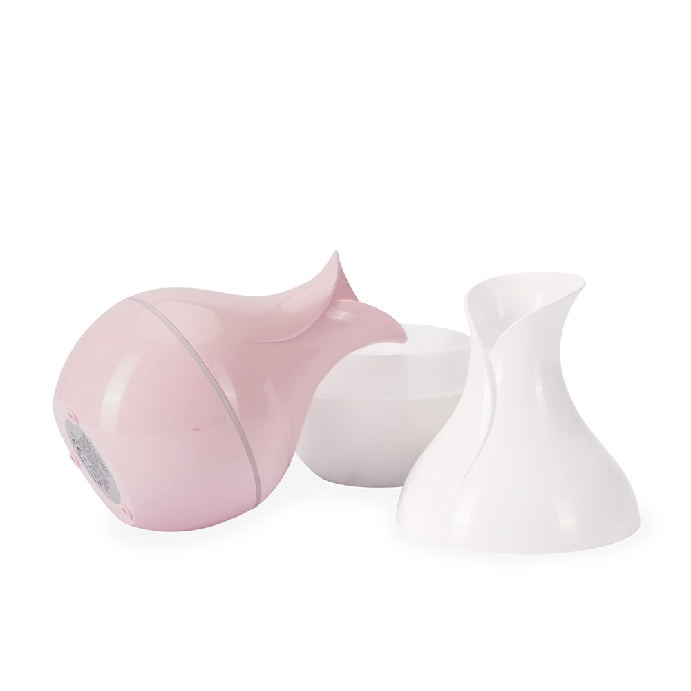 Umidificador de ar feito em plástico, com design inspirado em vaso, iluminação LED e reservatório de água com capacidade de até 200ml. Apresenta dois modos de névoa: o contínuo e intermitente. Funciona apenas quando conectado a uma fonte de energia por meio de sua entrada USB-C. Acompanha filtro de algodão e cabo USB-C.